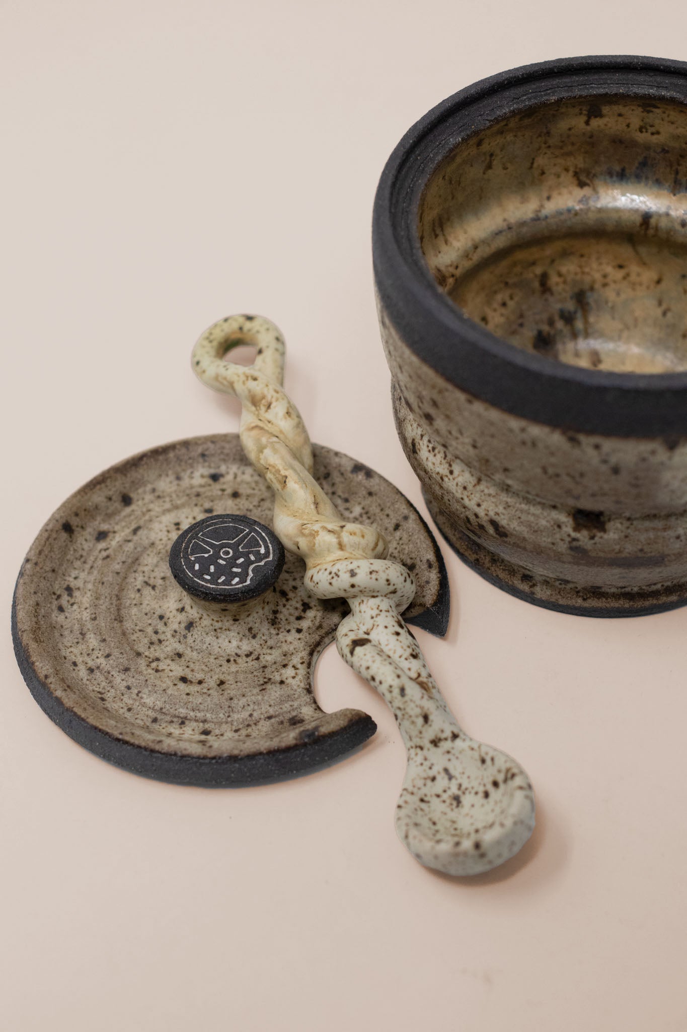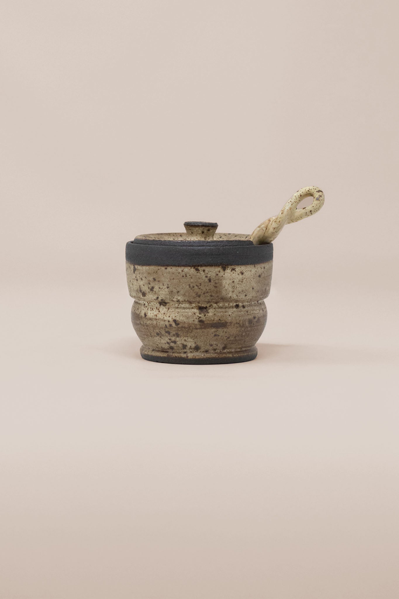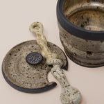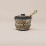 Handcrafted from high quality charcoal clay, every jar is deliciously glazed to perfection, delectably food safe, and comes with a matching lid and a hand pulled twisted spoon.