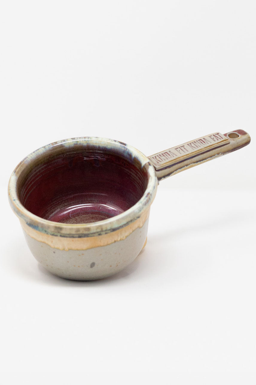 Our first specialty item on the Gourmet Gainz: Masterbaker’s Special Menu is "Minatamis Na Tabo" (translated to “sweetened ladle”). Featured here is 1 of 8 deliciously handcrafted ceramic tabos each representing a blend of functionality and quality artistry. Every tabo features a custom Kinda Fit Kinda Fat bar logo handle and a unique handglazed marbling, making each collectible piece a genuine 1-of-1.