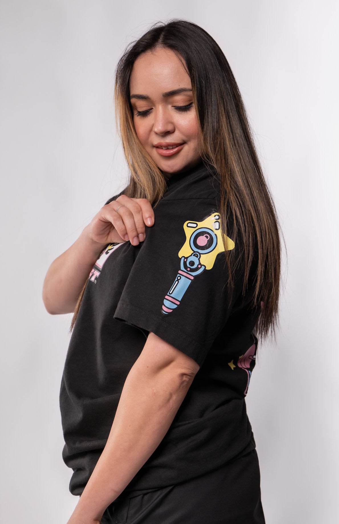 It’s so cute and such high quality. The shirt is thick and the perfect oversized fit. It’s so cute and I love the detail on the sleeve with the wand. Got so many compliments at the gym. Having cute shirts makes lifting more fun