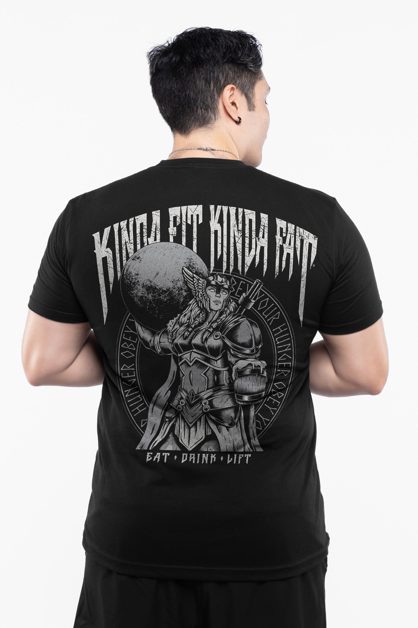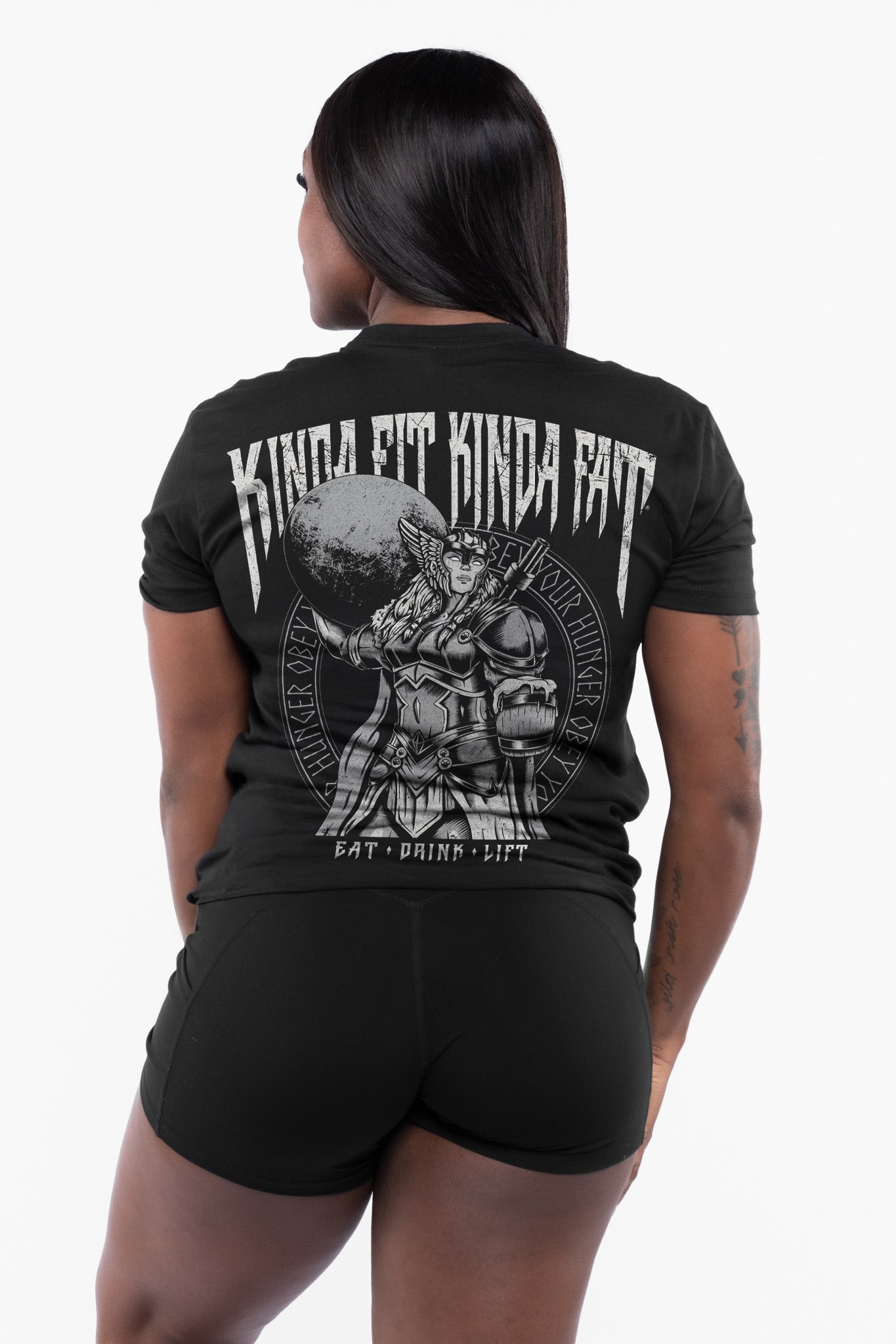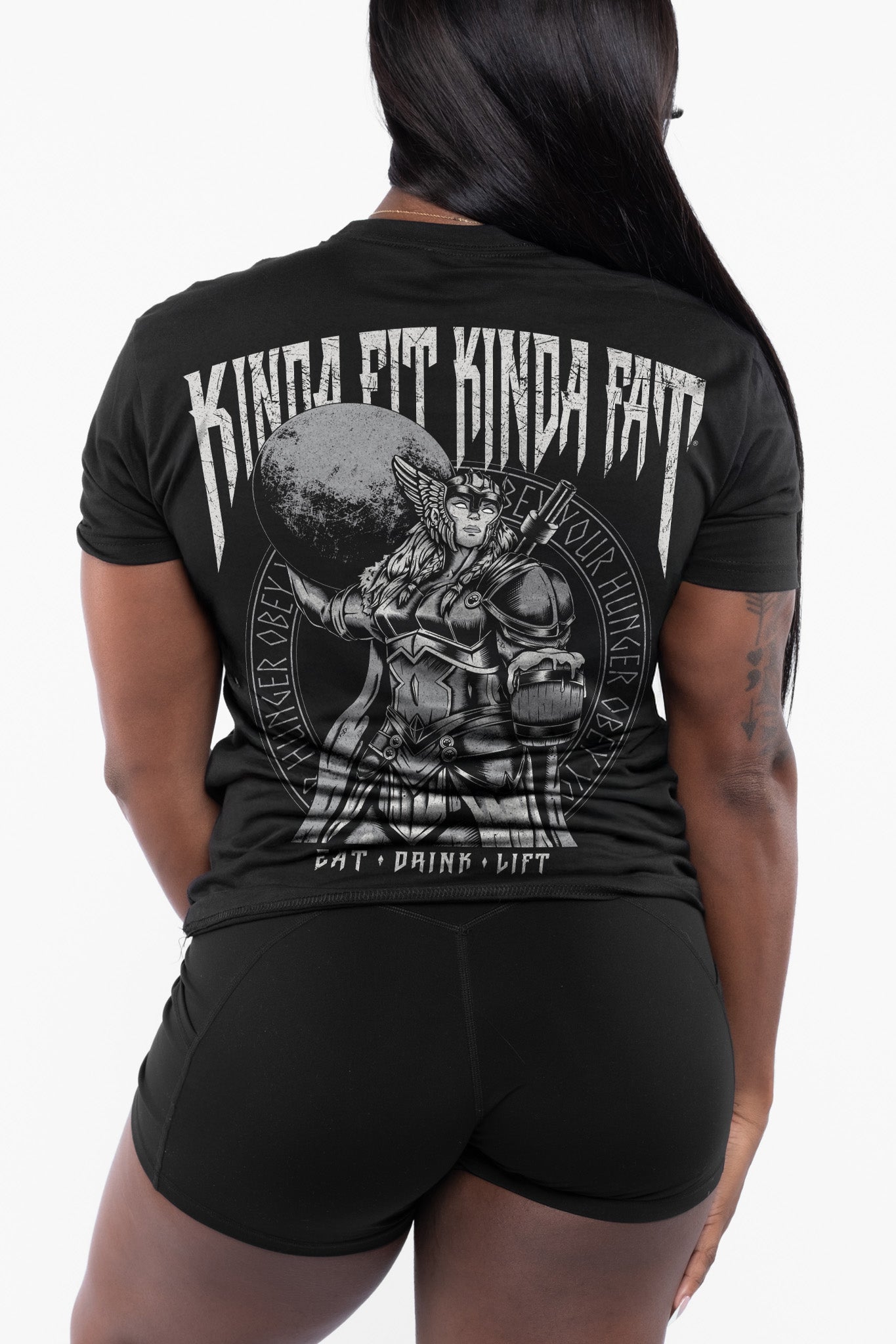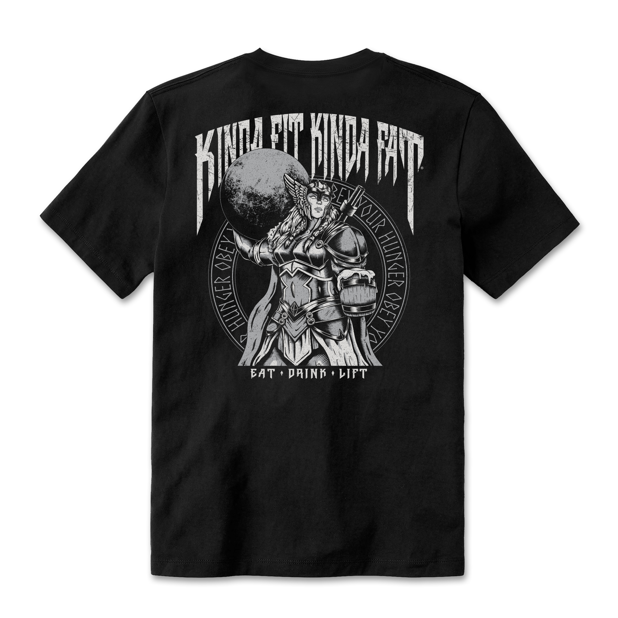 Introducing the Stone Maiden — a fierce fusion of Valkyrie valor and strongman savagery! Clad in battle-forged armor and powered by hunger, she is the summoned by atlas stones, kegs of brew, and lifting heavy. With “Obey Your Hunger” etched in her war sigil, she reminds us: strength is sacred, and so is the feast that follows!