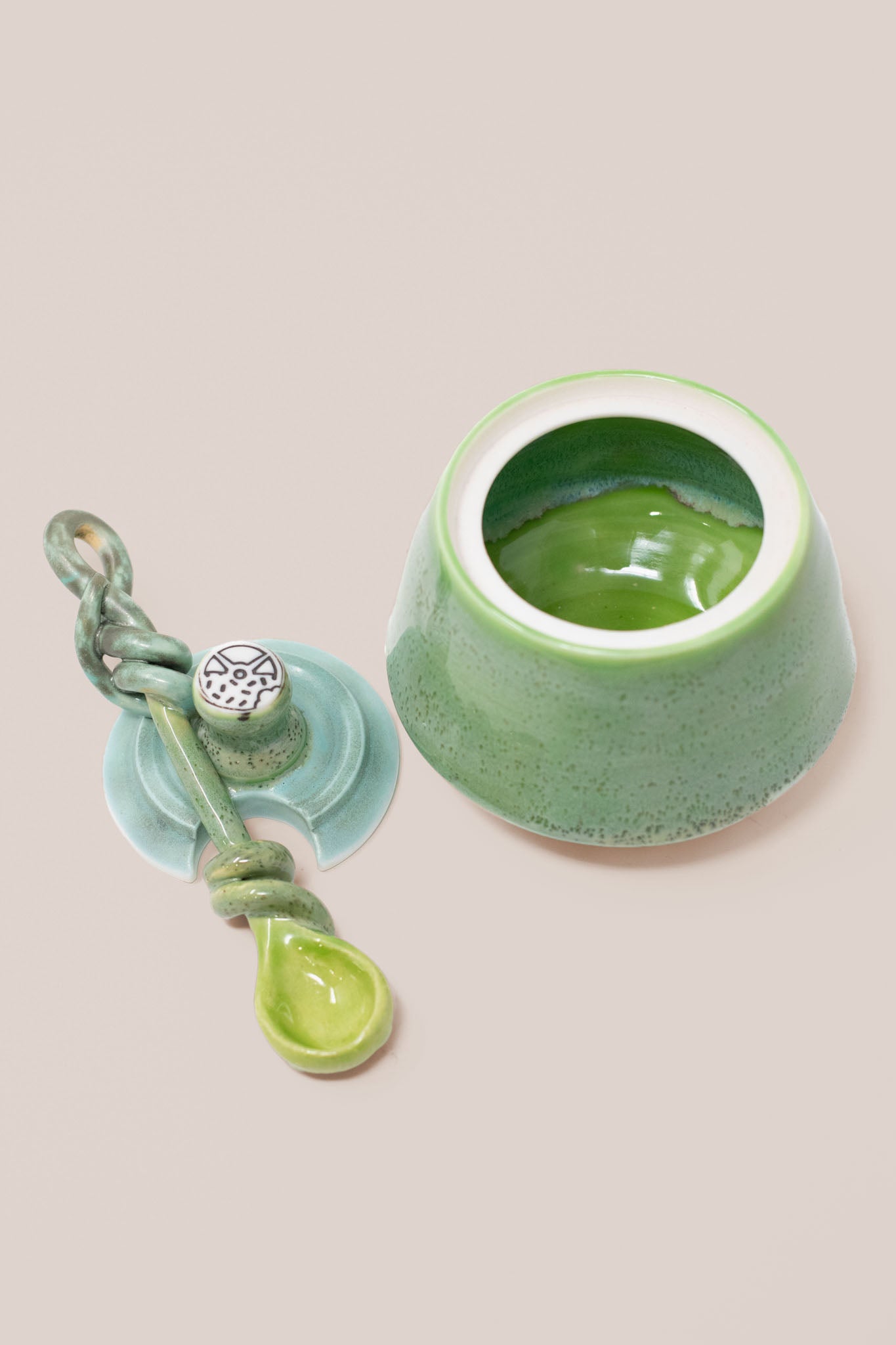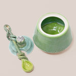 Handcrafted from high quality porcelain, every jar is deliciously glazed to perfection, delectably food safe, and comes with a matching lid and a hand pulled twisted spoon.