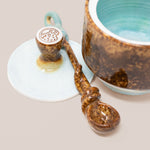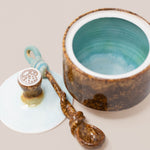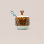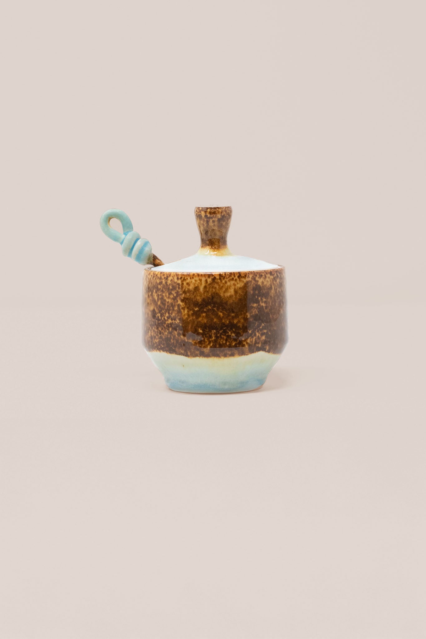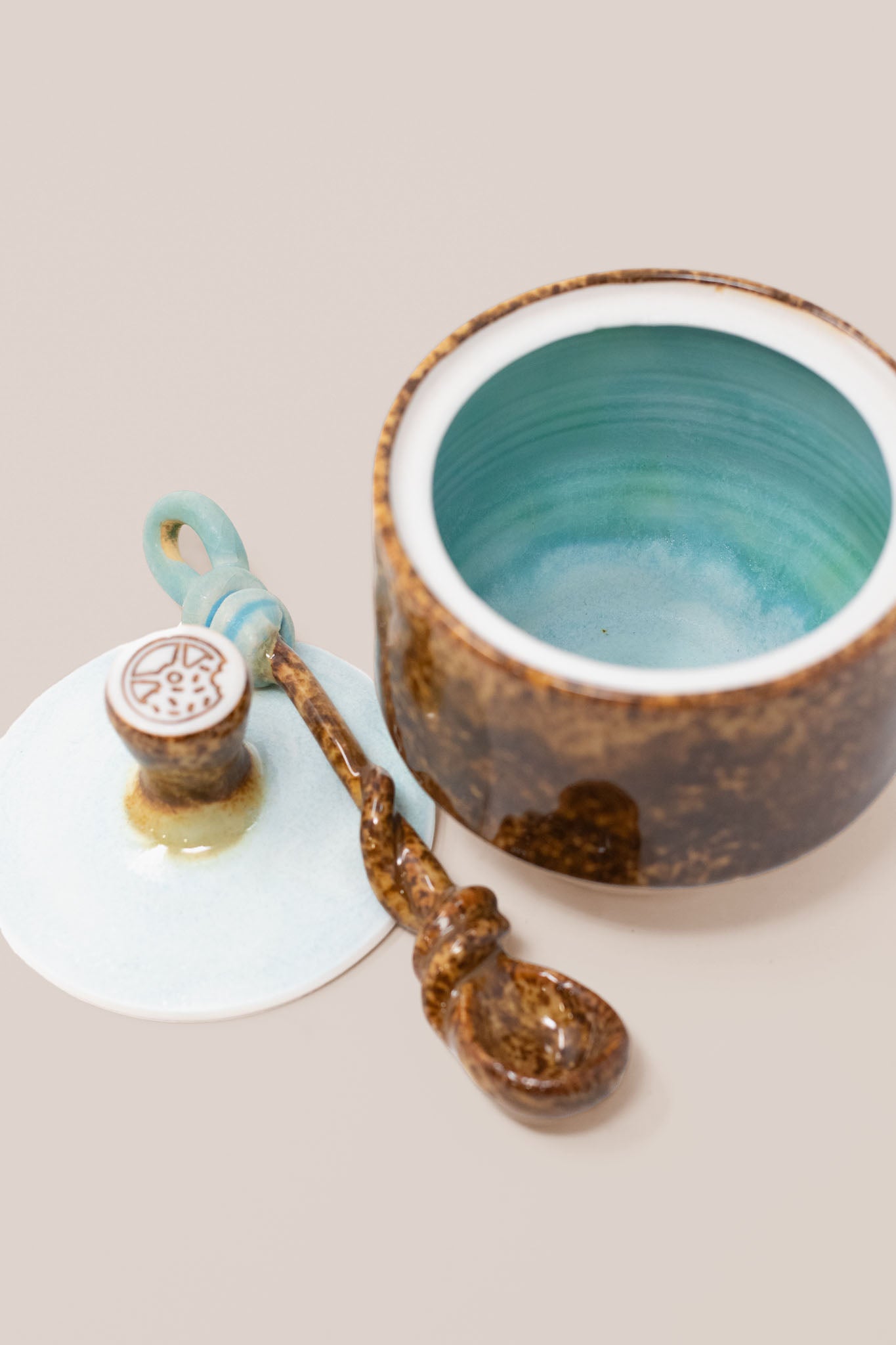 Handcrafted from high quality porcelain, every jar is deliciously glazed to perfection, delectably food safe, and comes with a matching lid and a hand pulled twisted spoon.