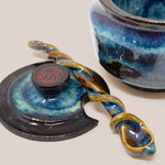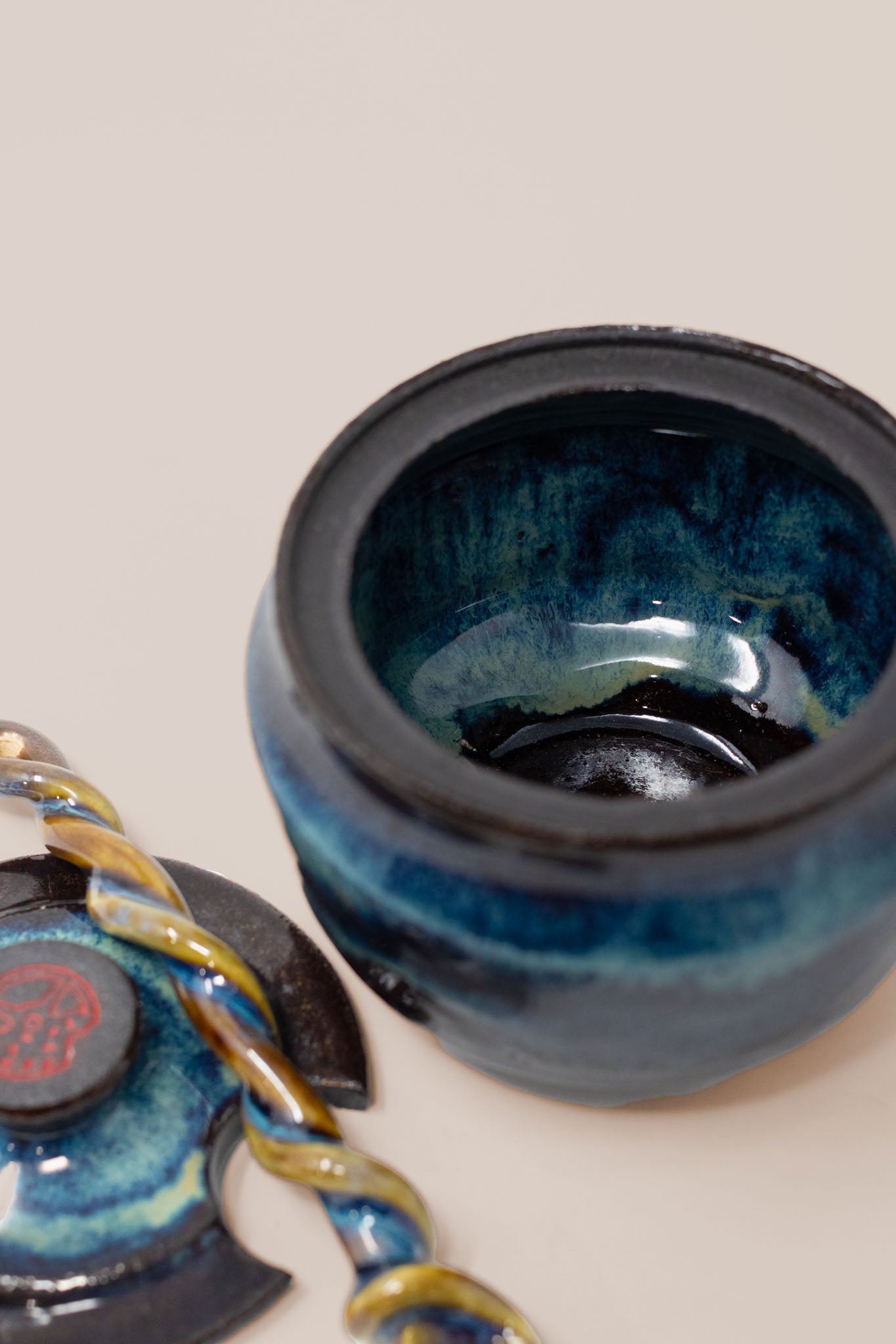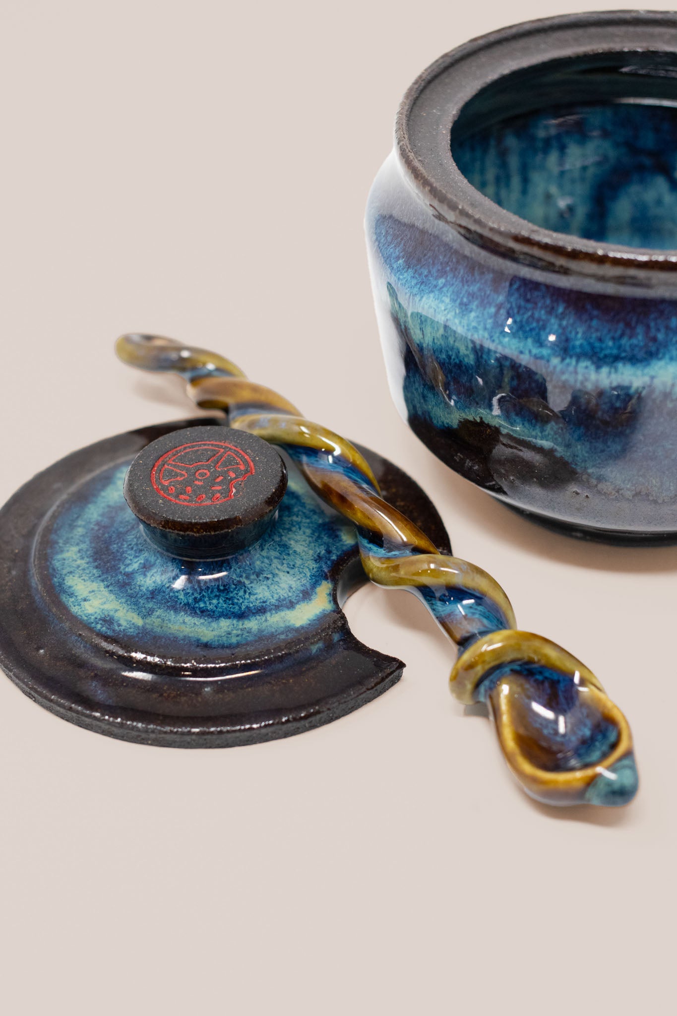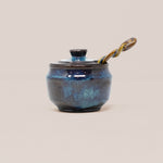 Handcrafted from high quality charcoal clay, every jar is deliciously glazed to perfection, delectably food safe, and comes with a matching lid and a hand pulled twisted spoon.