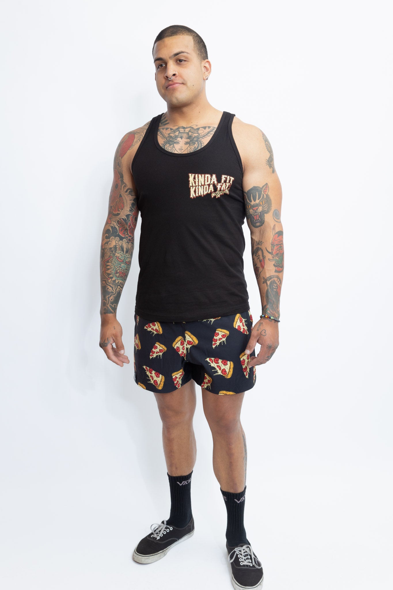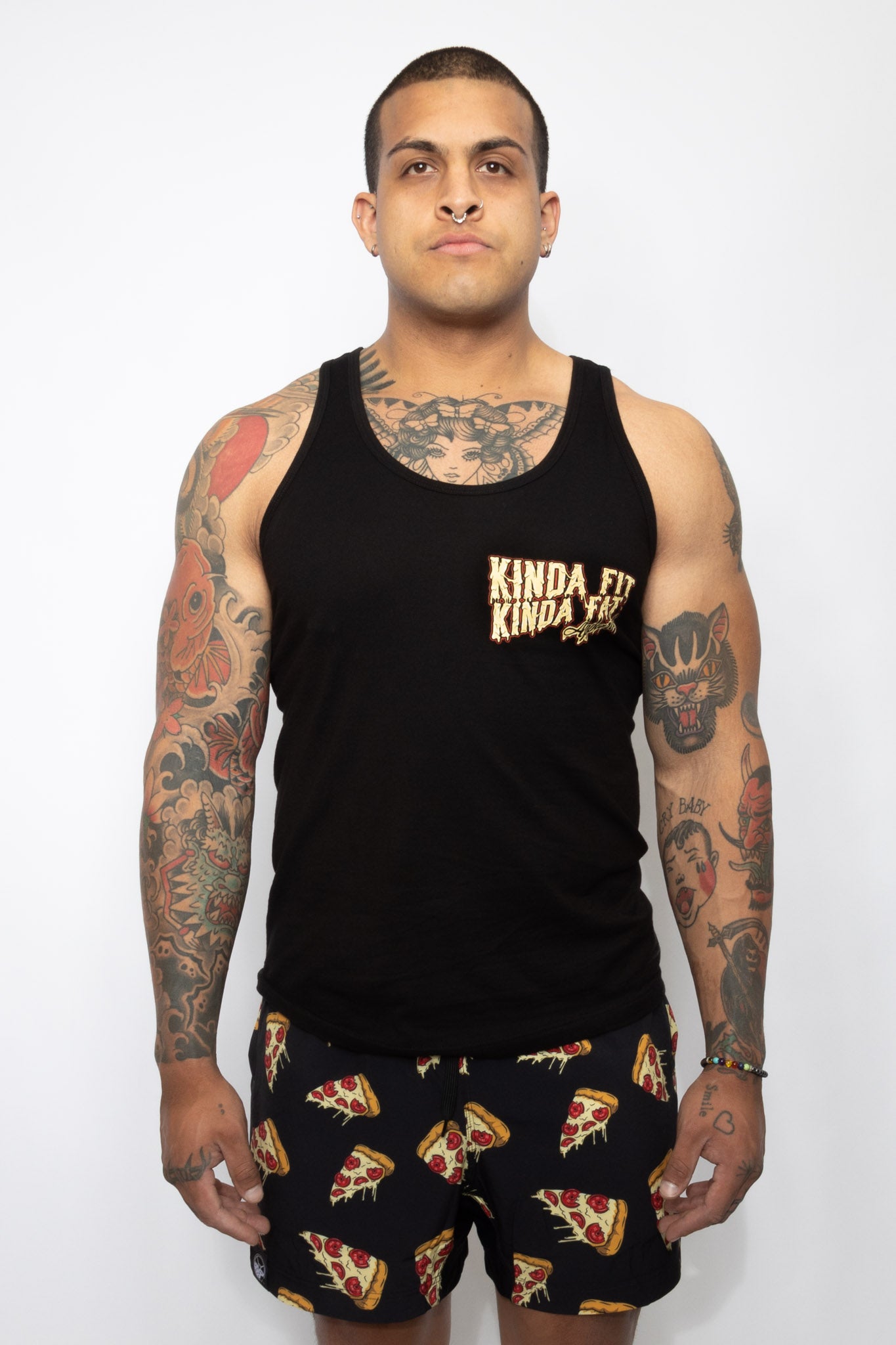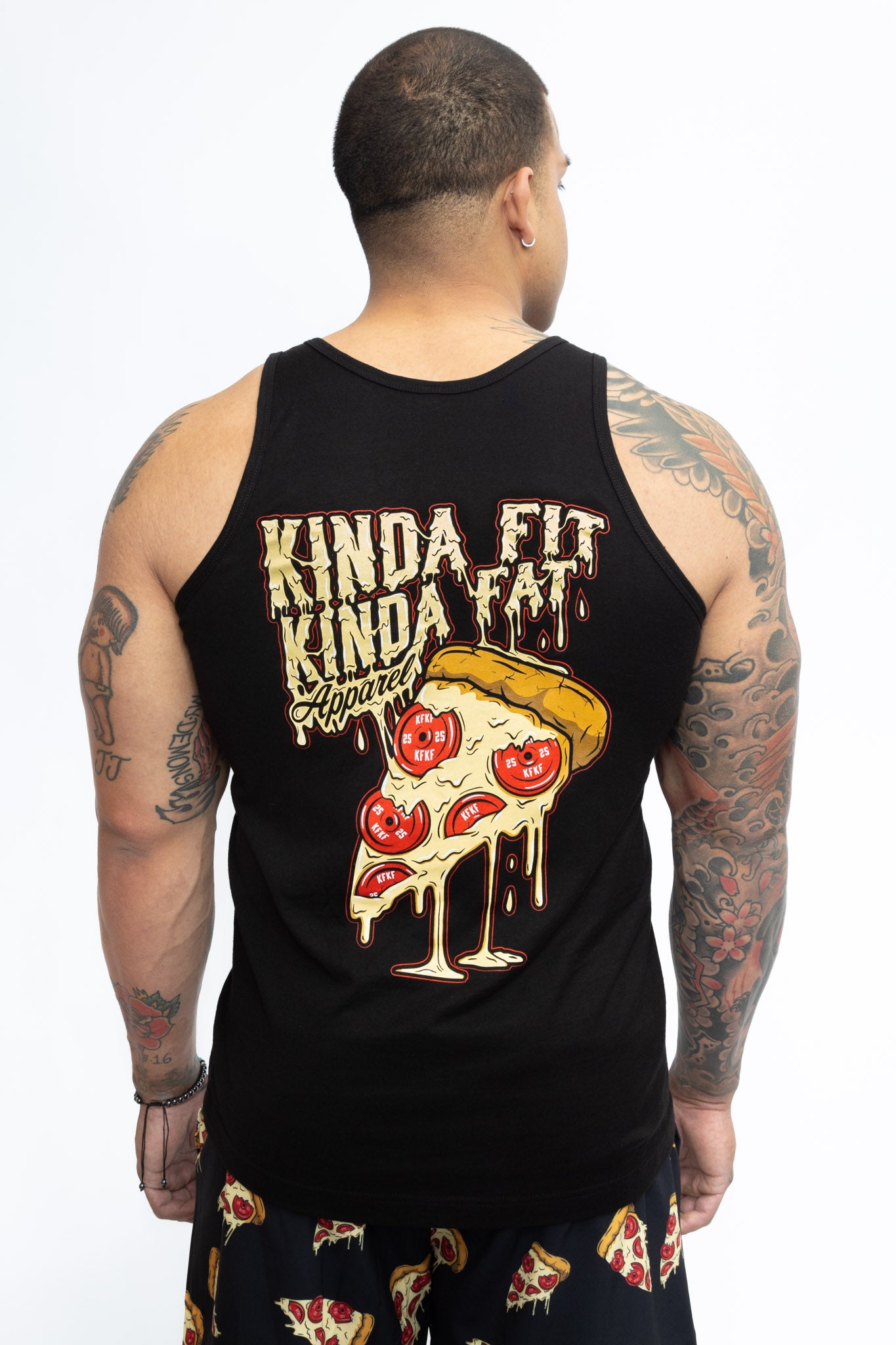 CHEESE the day with a drippy slice of PLATERONI PIZZA. Topped with crispy red pepperoni kilo plates, this comfortable tank top is a reminder that we're all a pizza work-in-progress! Whether you're devouring a slice.. or the whole damn pie, it's all about balance. Stuffed-crust your journey!