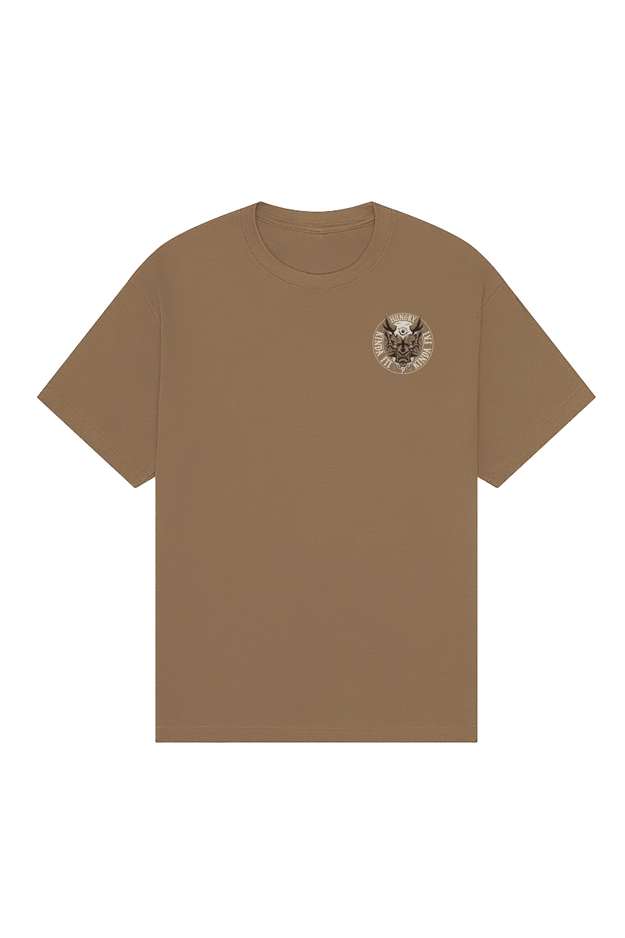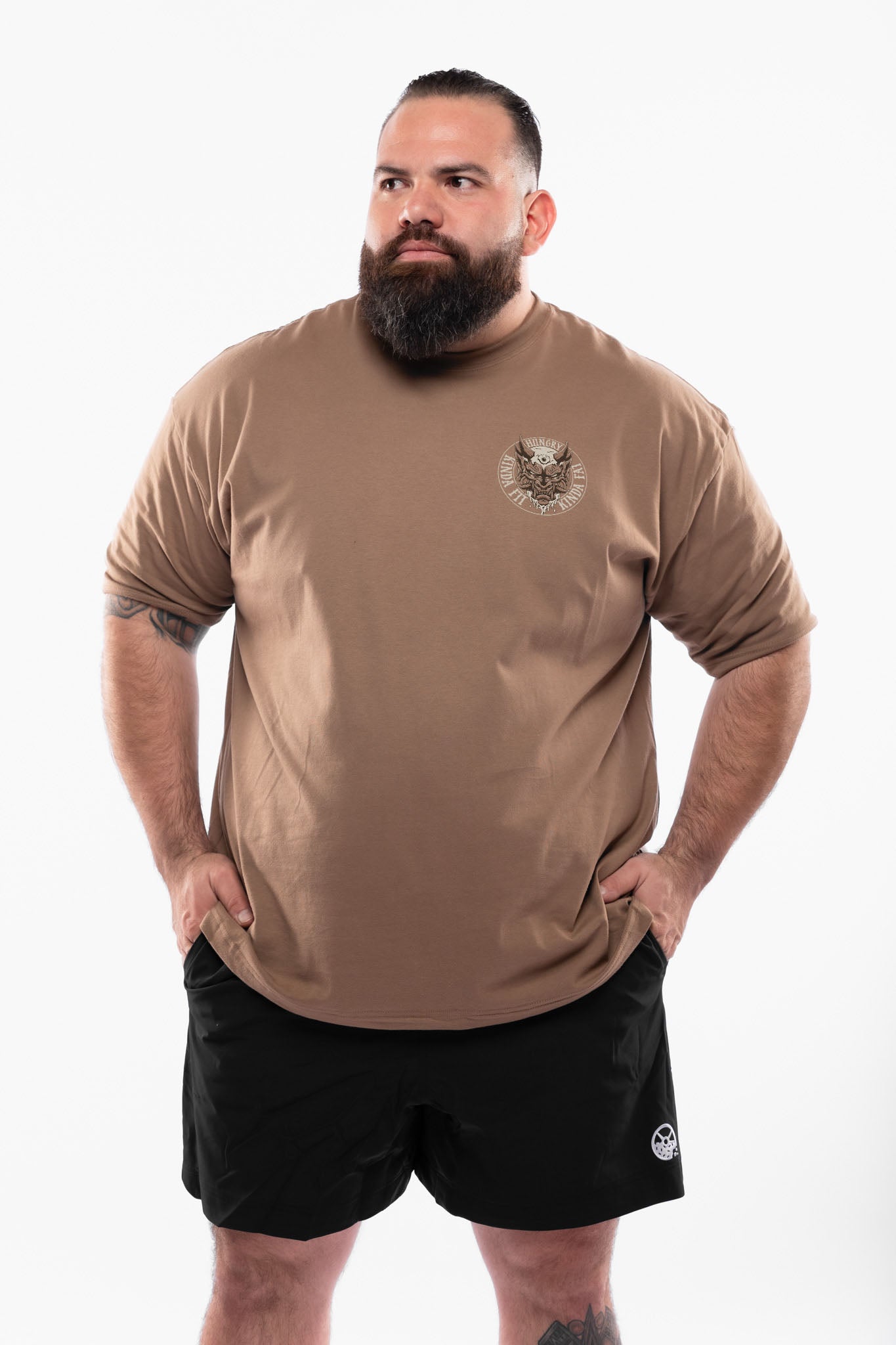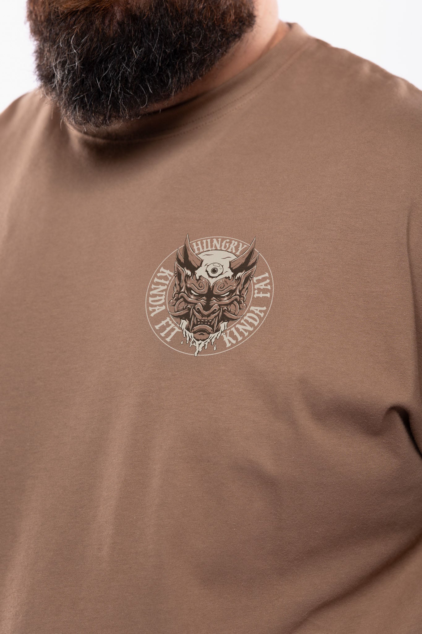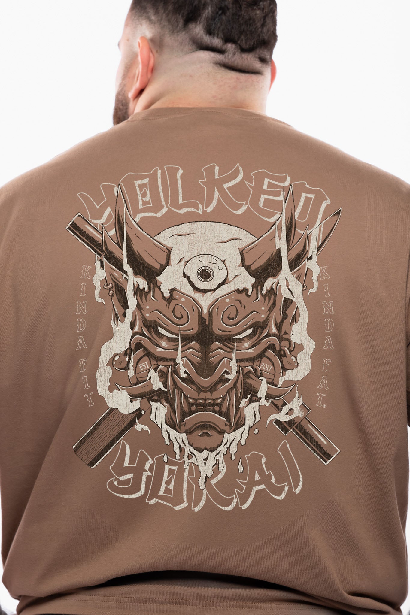 Man wearing a brown t-shirt with a graphic design on the back, standing against a white background